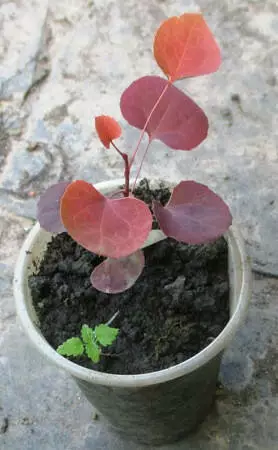 Листя округлі до 3-5 см в довжину, пурпурно-фіолетові з металевим відтінком влітку.