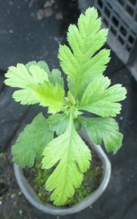 Нирки яєчнідно-округлі, завдовжки 2-3 мм. Листя — голе, тонке, на початку паперів схоже, потім досить щільне, з верхньої сторони темно-зелене, з нижньої — світло-зелене, в окресленні зворотно-яйцеподібне, завдовжки 2-6 см, завширшки 2-5 см; нижні листя цільне, лише на вершині зубчасті, інші — трилопатеві, лопаті частіше тупі, рідше гомілкі, місько-зубчасті, рідше гострозубчасті, середня іноді тринадрізна; на неплідно-побігах — більші, ширші та більш глибоко розсічені, 3-5-роздільні. Черевики повстяно-пухшені, завдовжки 0,8-2,0 см.
